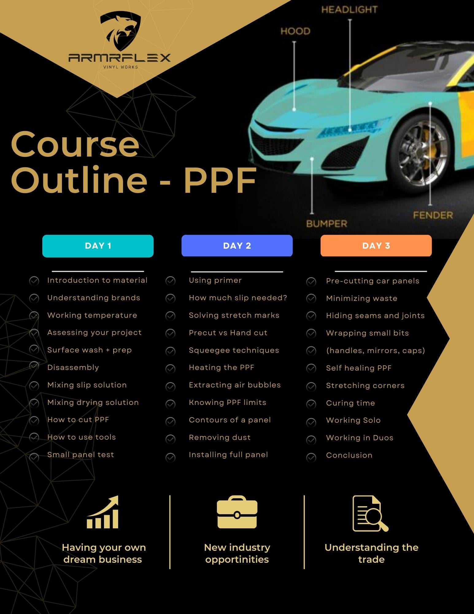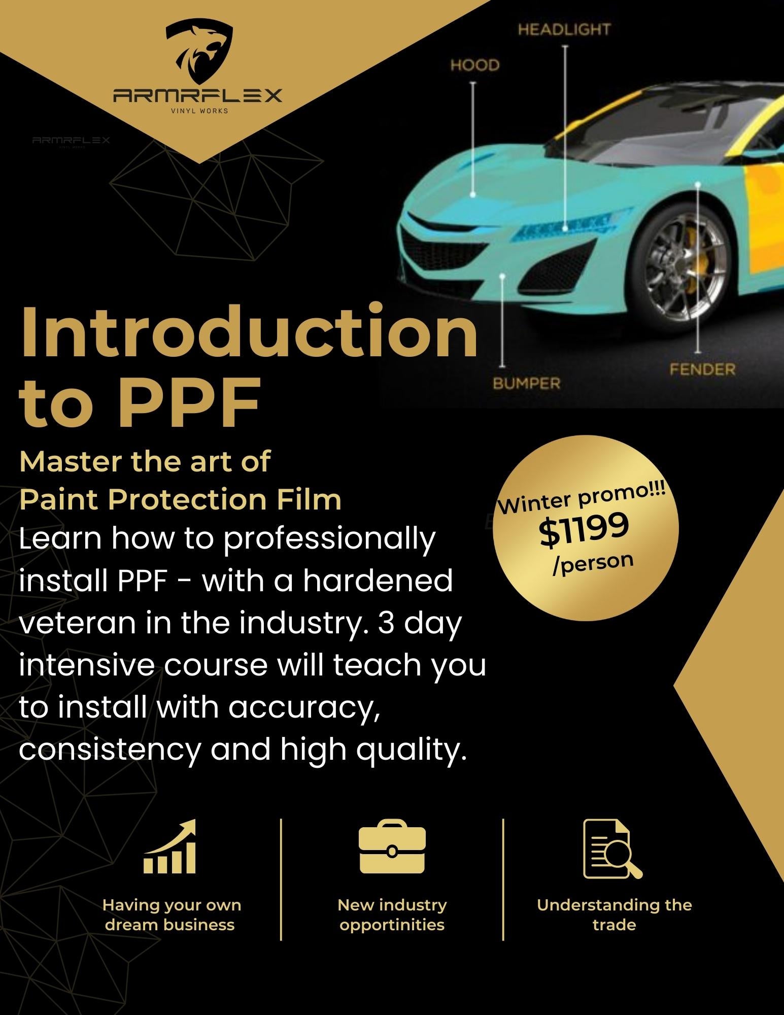 Learn how to professionally install PPF - with hardened veteran in the industry. 3 day intensive course will teach you all the basic knowledge to pick up the PPF and lay it on panels - with consistency , accuracy and high quality.